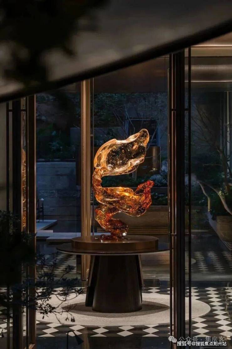如山茶花般的定制石雕,映衬厚重的朱氏铜门,配上两侧大面荷塘月色奢石、铂金钻石材景墙,远远望去,宛如歌剧开幕时垂坠的天鹅绒帷幔,打开归家的仪式感。