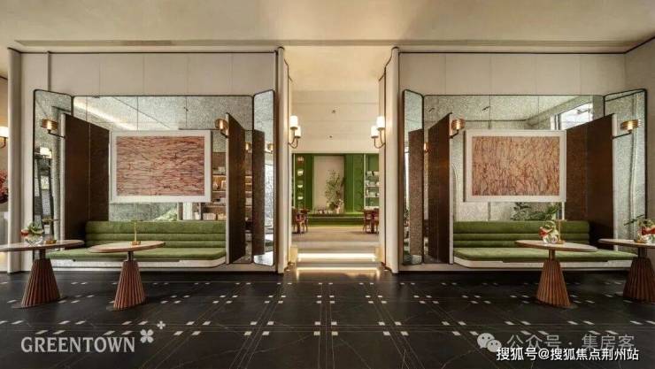 宽约60米、高约10.35米的大门,以「翡翠帷幔」为概念。顶部三段式发光云石吊顶,与下部四根芬迪白奢石立柱相互对应,呈现端庄稳定的古典美学气质。