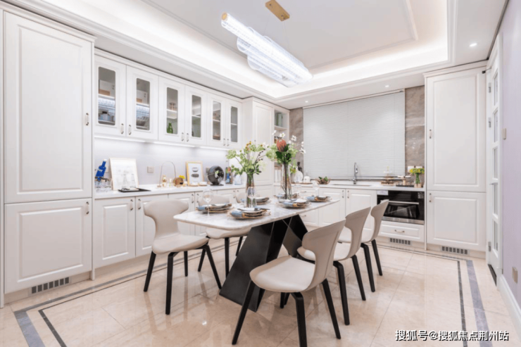 围绕着餐厅的墙面都规划了收纳和操作台体系,其实,万科并不是把厨房做小了,而是把厨房细分成了两个区域: