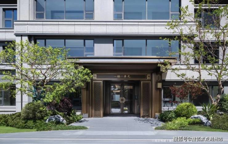 远远看过去,兰亭和颂气质和其他楼盘很不一样,浓烈的新中式建筑风格,五闸三启式的王府规制大门,配以宏大简练的歇山顶,加上硅酸一体板+浅色真石漆+深色金属漆的外立面,很是气派