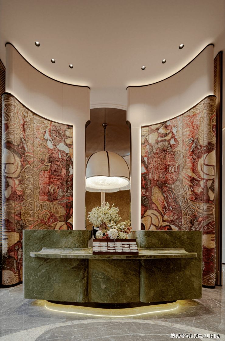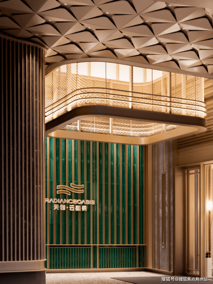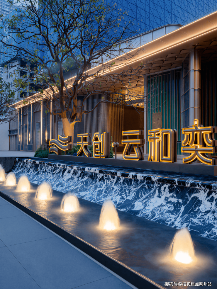 天创云和奕的大门,光是第一眼就足够惊艳——约60米超宽尺度,打破常规住宅大门的局促感,成为汉阳大道上极具辨识度的人居封面。大门立面采用爱马仕同源非遗冰裂纹陶板铺陈,纹理如翡翠冰裂,温润细腻,即便废料率高、施工难度大,项目仍不计成本打磨,只为呈现顶级审美质感。利落的现代线条搭配金属勾勒,透光云石点缀其间,两侧对称水景潺潺流淌,搭配艺术装置,未入社区先显尊崇,每一次归家,都是一场充满仪式感的奔赴。