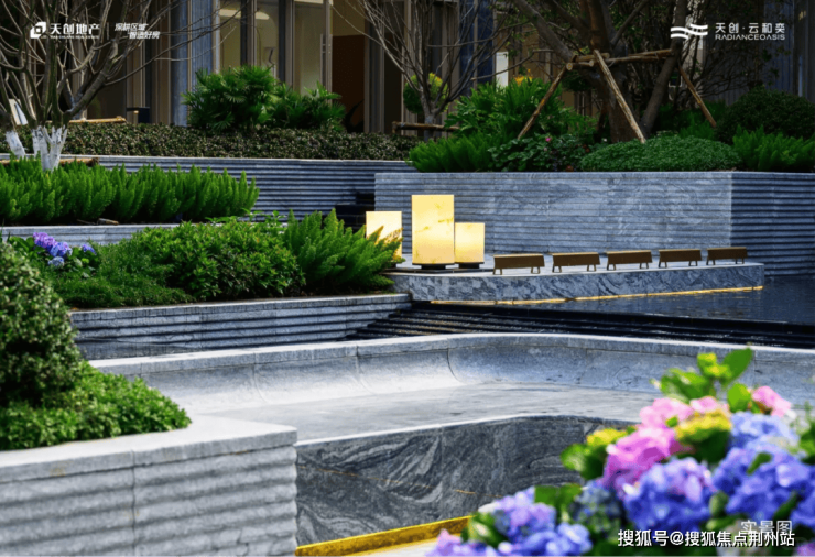 天创云和奕以“镜花水院”为核心理念,打造三重五景立体景观,而水景庭院,正是这座园林的灵魂所在。这里没有喧嚣,只有流水、浓荫与光影交织:中央奕水沉瀑潺潺流淌,镜面水景倒映草木,雾气氤氲间,弱化了建筑的硬朗感;疏影奕庭藏于浓荫之下,休闲卡座搭配艺术雕塑,是业主休憩、邻里闲谈的自然会客厅;设计形成立体高差,叠翠云台、游心花屿等节点错落分布,曲径通幽,步移景异,春有花、夏有荫、秋有叶、冬有景,把自然搬进社区,日常皆是治愈时光。