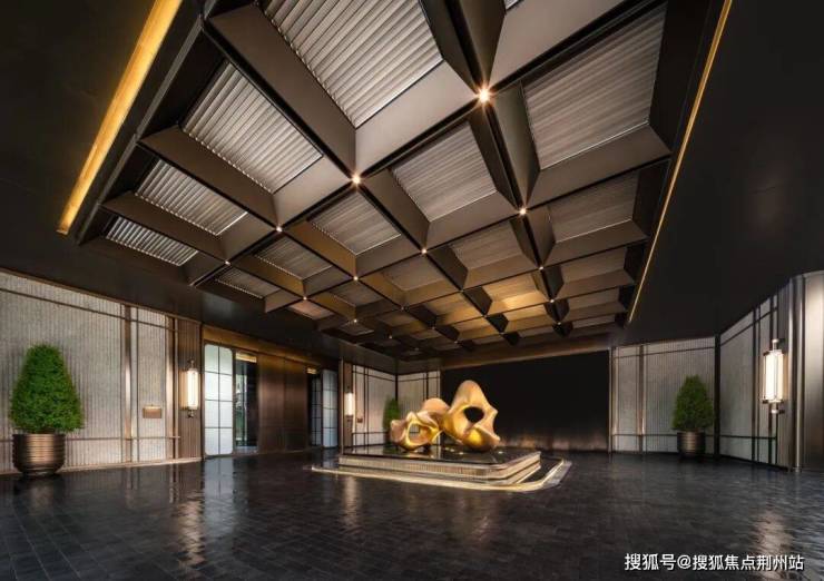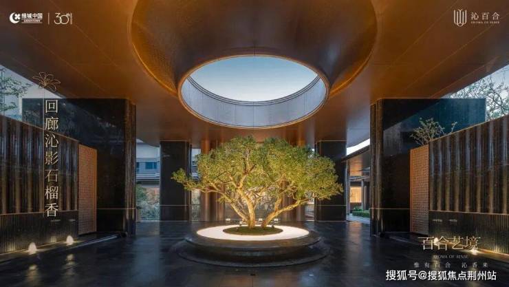 项目采用三进式礼序门庭。第一进,是约40米的气派头门,立体百合雕塑为核心,通过材质、光影、水景与绿植的巧妙结合,打造出礼序、灵动且富有艺术感染力的入口空间。