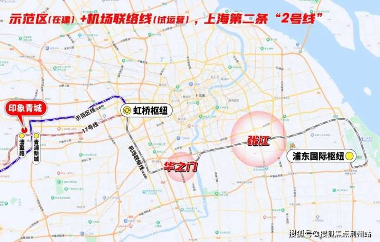 但这还不是全部,17号线+示范区线左手长三角一体化、华为,右手前湾、大虹桥总部商办,并通过虹桥枢纽,串联2号线及正在试运营的机场联络线,把市中心、徐汇、闵行、张江等高能板块都纳入印象青城的通勤版图。