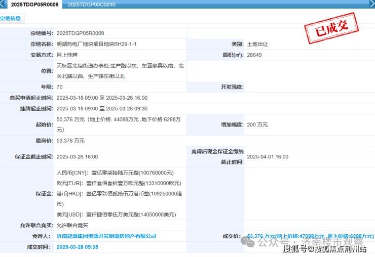 在当时的土地拍卖中,济南能源集团旗下公司经过多轮出价,最终以56382万元成功竞得明湖热电厂两宗地块,包含约43亩的居住用地和约9亩商业用地。