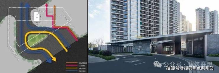 规划通过人行、车行与非机动车流线的精确分离,构筑出井然有序的交通体系。主要出入口以环岛式落客流线展开,缓和城市与居所的交接节奏。归家的路径遵循“三次空间转换”的秩序,从公共到社区,社区到单元,再由单元归于室内,层层递进。