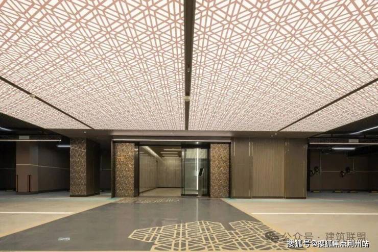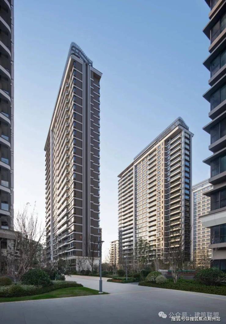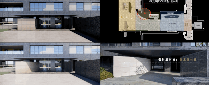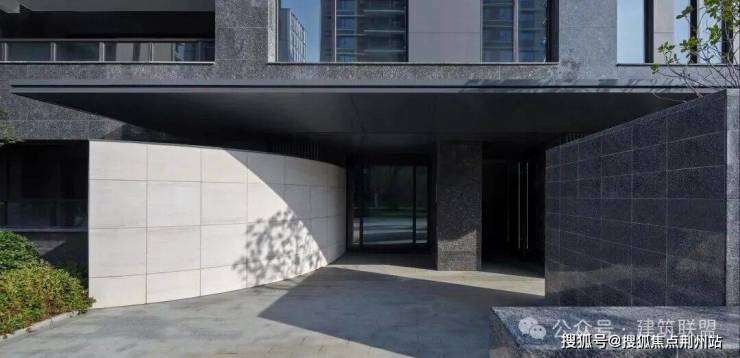 单元入口处,花岗岩景墙与仿木纹石材的引导性弧形墙面相互交织,以质感的对比与曲线的延展,营造出幽深的空间感,强化了归家动线的仪式感与节奏感,仿佛穿行于庭院深处,感受到一种静谧而温润的归属氛围。