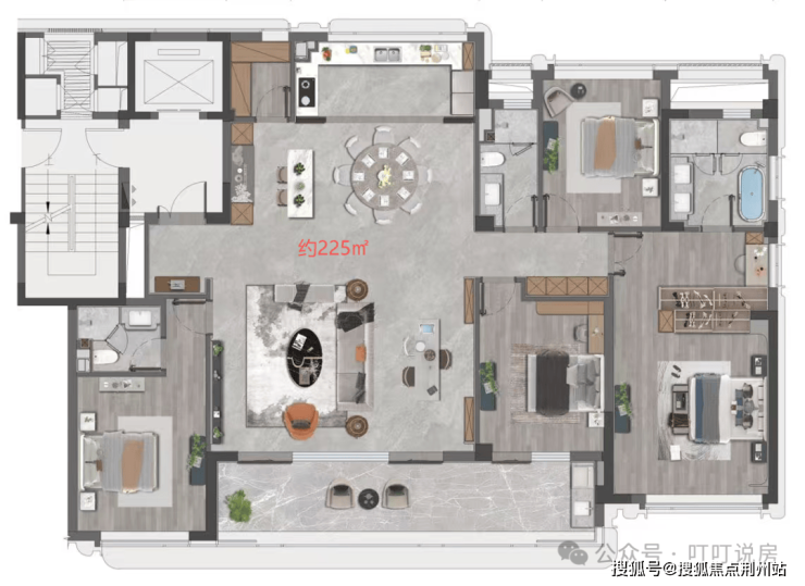 四房两厅三卫,比195㎡多了一个储藏室和一个多功能区。层高约3.15米。