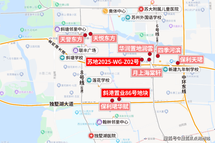 北面和西面是住宅小区莲花新村,东面则是斜港置业竞得的86号地块,南面是独墅湖大道,隔河就是住宅小区翰林缘。
