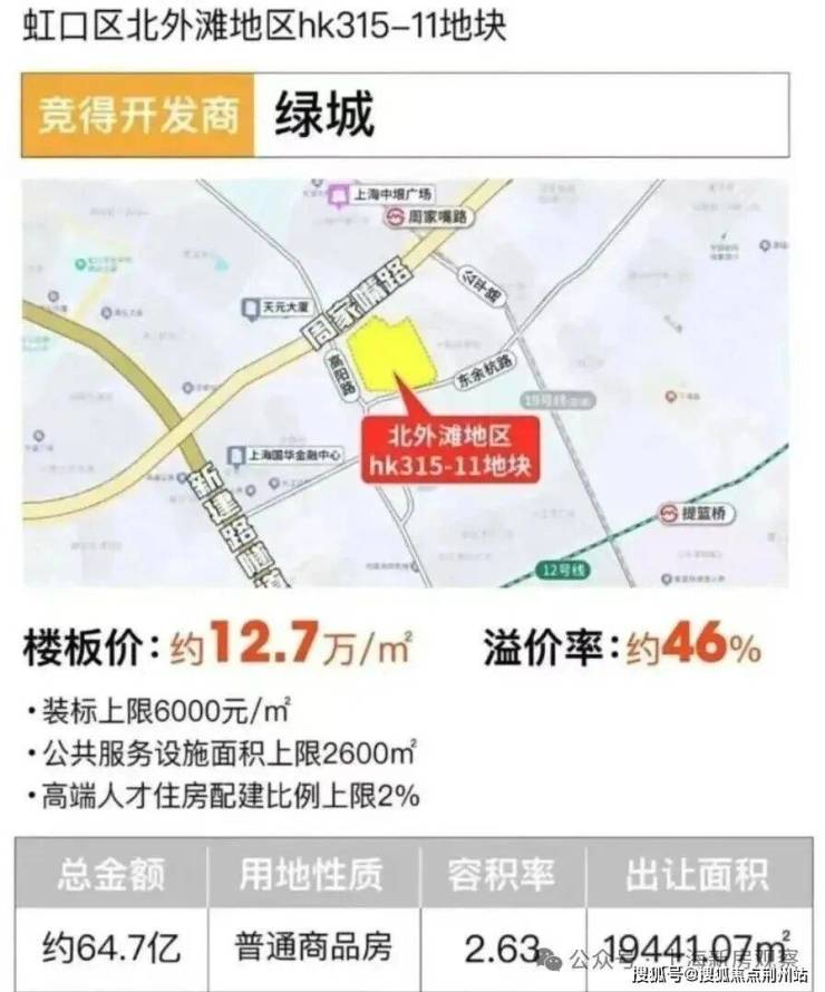 该地块在7月25日举行的上海第六轮土拍中,绿城以总价64.72亿竞得;