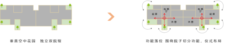 每户配置两部电梯,归家与后勤动线互不干扰,归家私密性与领域尊崇感十足。较之当下流行的空中院馆,竖向空间尺度更震撼。