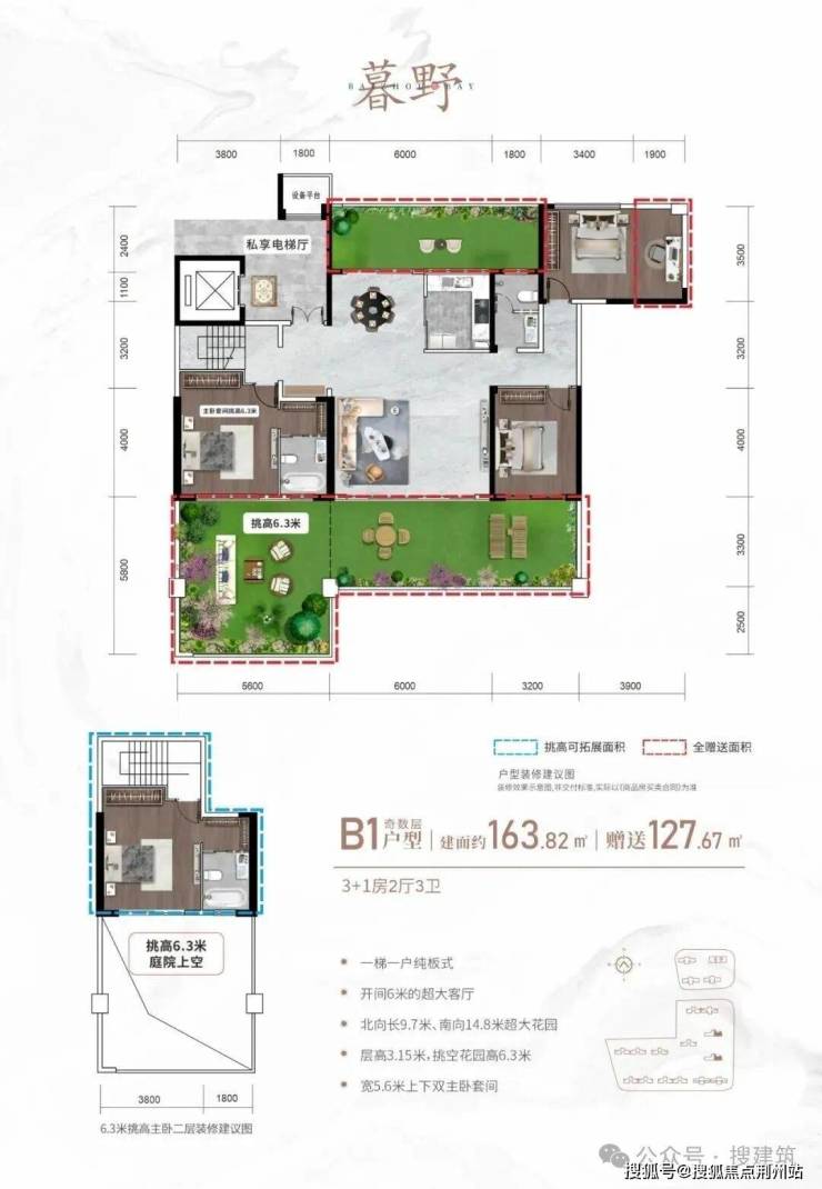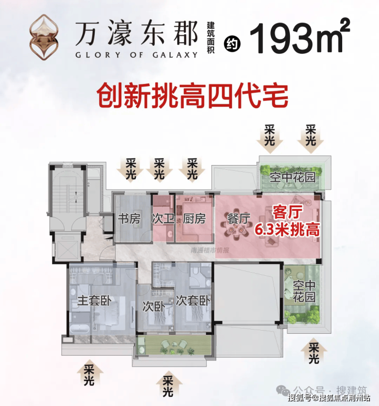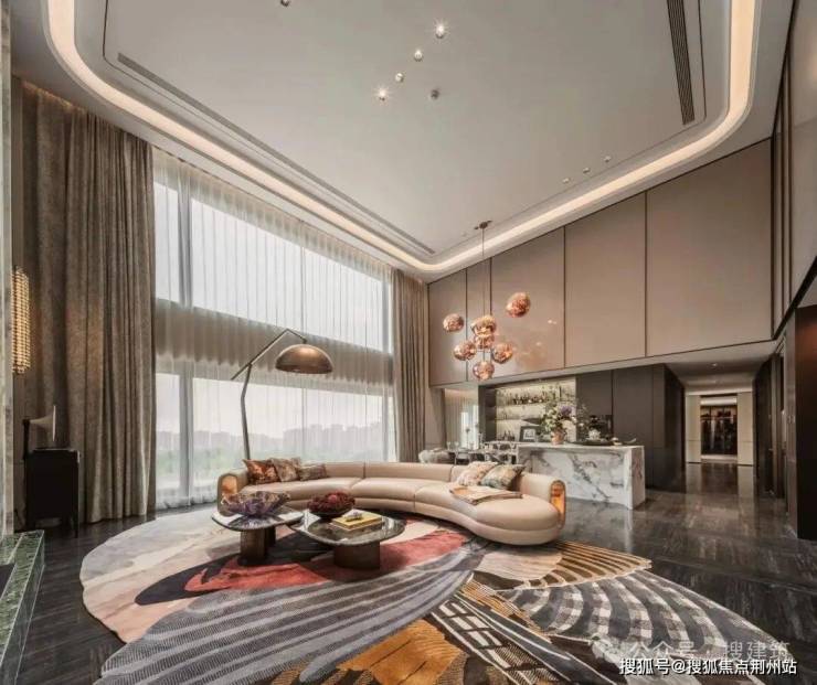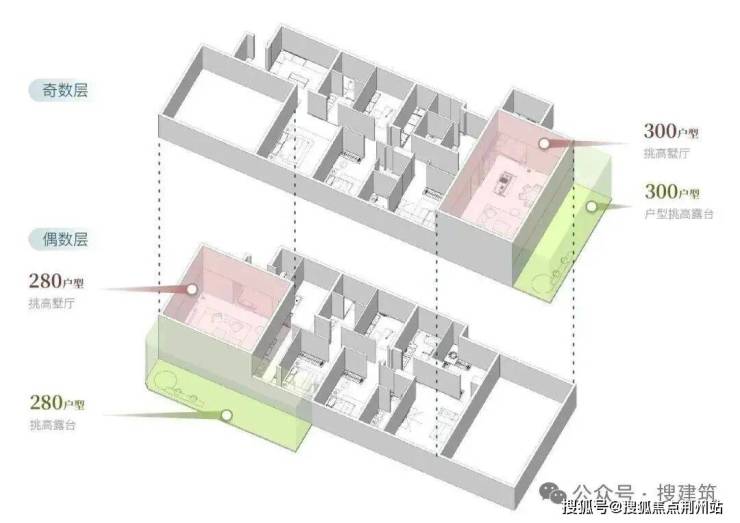 比如南通万濠东郡项目,通过奇偶层错位互相咬合的设计,让客厅及露台通高挑空,单层层高达到3.15米,客厅挑高达到6.3米。