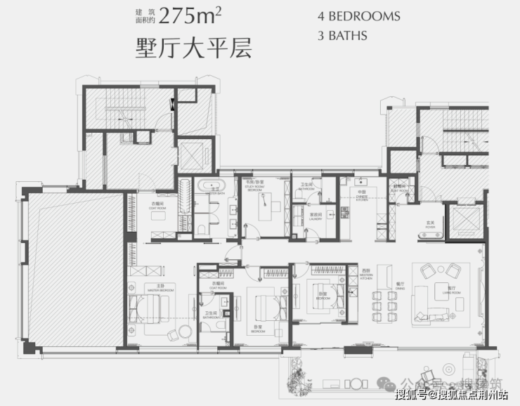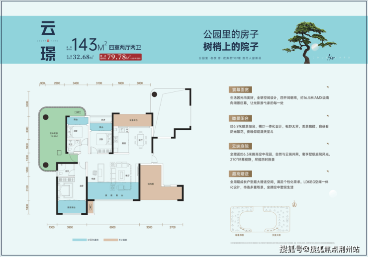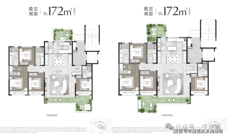 华润望雲建面约172平的户型,对标市面上185平的户型,亮点是四面宽客厅6米大开间,南北双露台,都是方正实用的小院式露台。