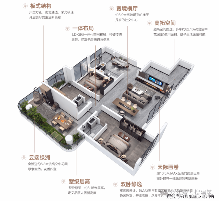 户型设计兼顾了户内功能和空中花园场景的产品创新:让客餐厨、阳台、空中花园无界共融,打破了室内外空间的边界,形成更为完整、宽阔的生活体验。