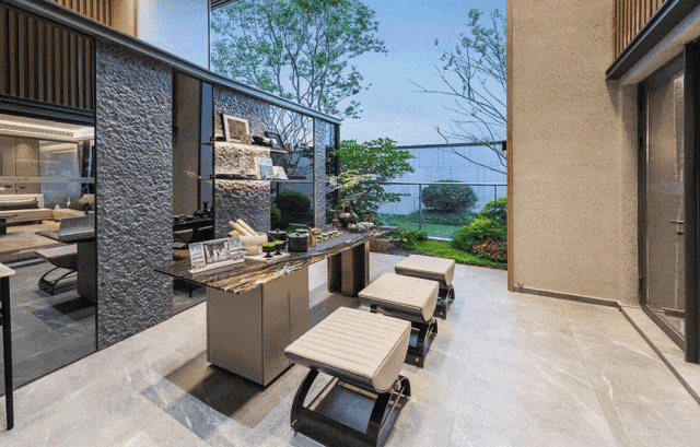 客厅的使用面积达到了100㎡以上。LDKG一体化设计,形成一个超大家庭聚厅,可以兼容丰富的生活场景:家庭party、亲友聚会、露天烧烤、夜幕观星、花园读书会……