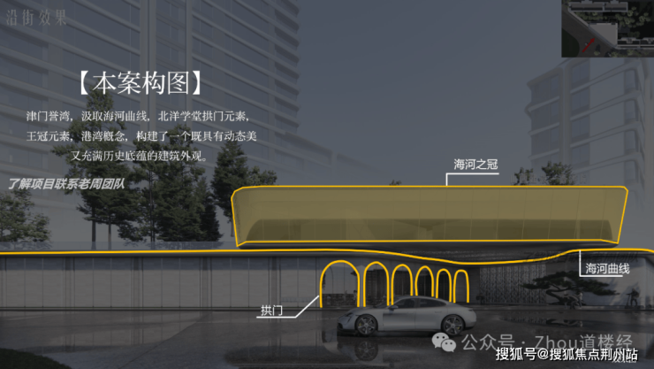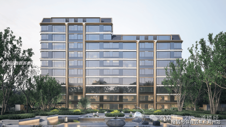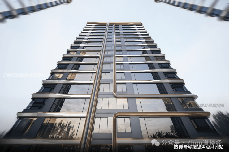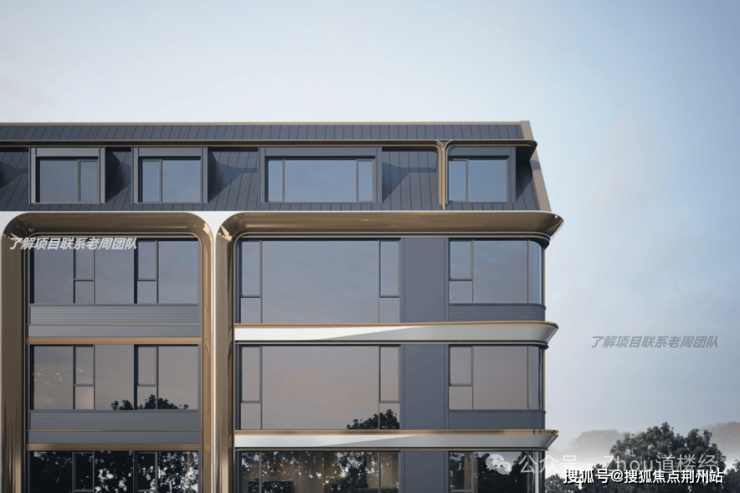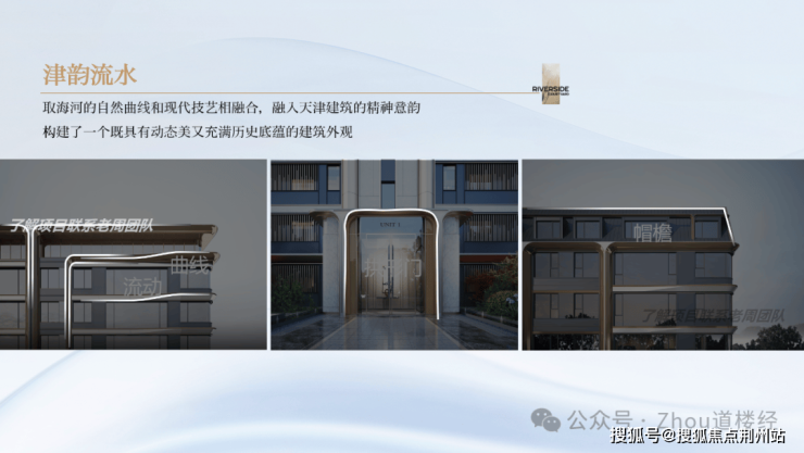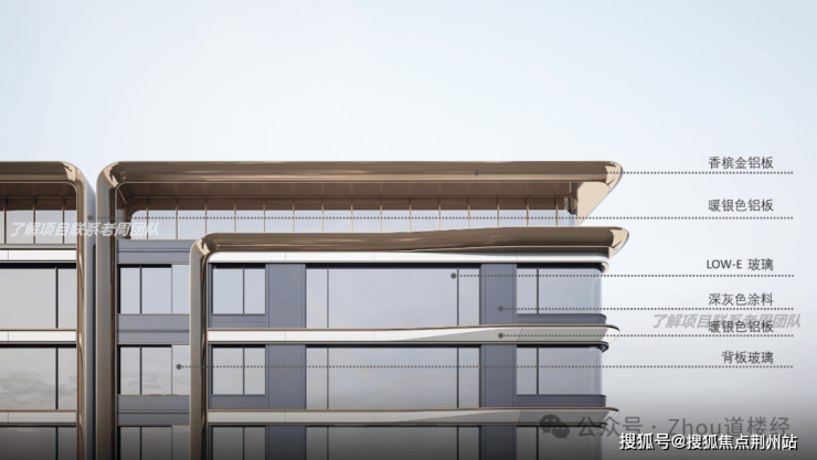 建筑外形将海河水纹与学士帽造型相结合,以香槟金+暖银色铝板+LOW-E高透玻璃为主材,精细打磨建筑曲线,如在立面吹皱了海河的波澜。