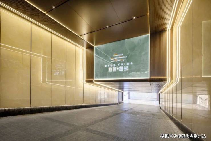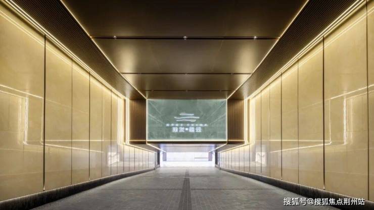 古铜色铝板吊顶,内嵌线型灯带,形成一条璀璨的归家“鎏金廊道”,一直延伸到地下。