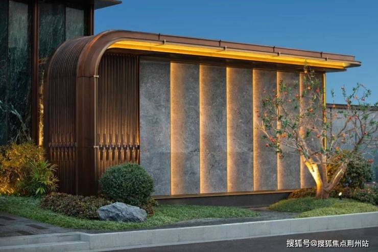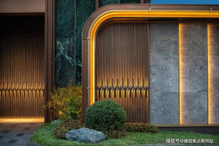 大面积猫眼绿石材墙体与古铜色金属飞檐碰撞出古典且现代的隽永美感;局部香槟金色不锈钢作点缀,演绎雅贵的隐奢;两翼星耀灰石材的景墙,将新中式气质展现于方寸铺陈。