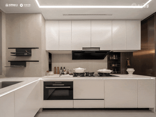 不止是家政间,整个户型空间的收纳交付,也是鲸吞级的,餐边柜,一样是交付标准,奢石台面,配置下水,家人在厨房烧菜,也不妨碍餐边柜泡咖啡、洗茶杯。厨房配备博世的灶台、油烟机、蒸烤箱+洗碗机。细节之处,仿洞石的岩板,还有橱柜里的天使拉篮等,康定壹拾玖同款。