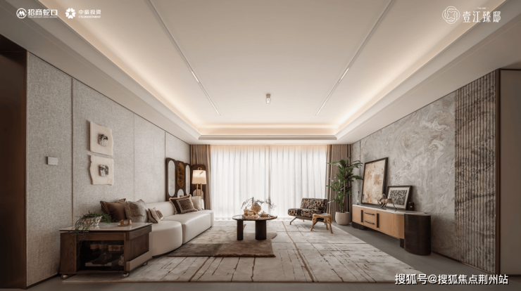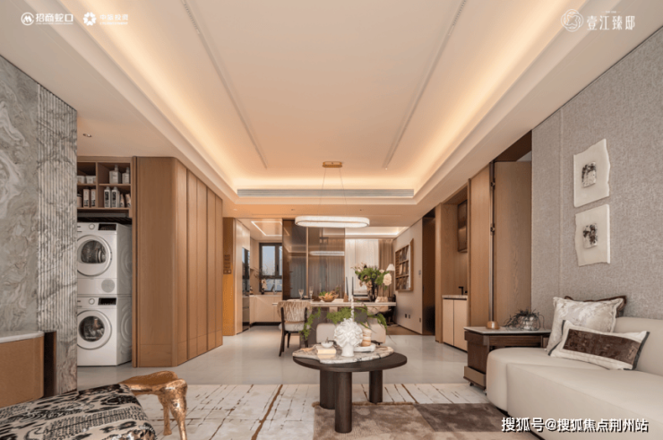 超尺度的城市界面,就像一座艺术长廊,来往行人,步行至小区转角处就能看到奢石打底的景墙上,壹江臻邸logo镶嵌其中,昭示感于此爆发。转至社区大门,招商“揉石成缎”,用大量石材,通过水刀雕刻、手工打磨、高精度抛光等复杂工艺,塑造了独特的归家仪式感。