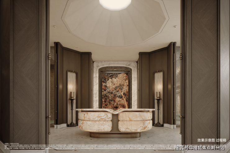八角厅主挂画,复兴“螺钿”这一濒临失传的非遗工艺。匠人以珍稀贝类为墨,手工切割、镶嵌。栖境泳池,曲线穹顶、奢石立面和下沉庭院景致相融,天光经采光井漫洒,云影徘徊。