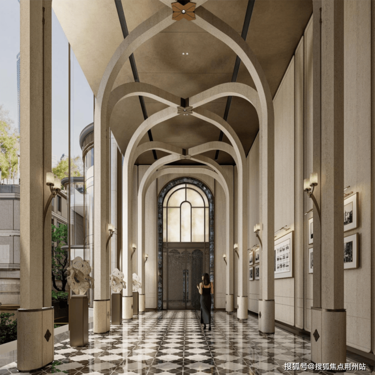 在项目展示区中,设计团队也广泛应用天圆地方理念,比如会所半圆弧设计,雕塑区椭圆设计,圆环吊顶,取自石库门意象的艺术长廊,秘境花园的方形围合等。在中轴景观带中,项目引入传统礼序观念,通过门堂递进、中轴对称、景观步道,再现世家门第的仪式感、秩序感。