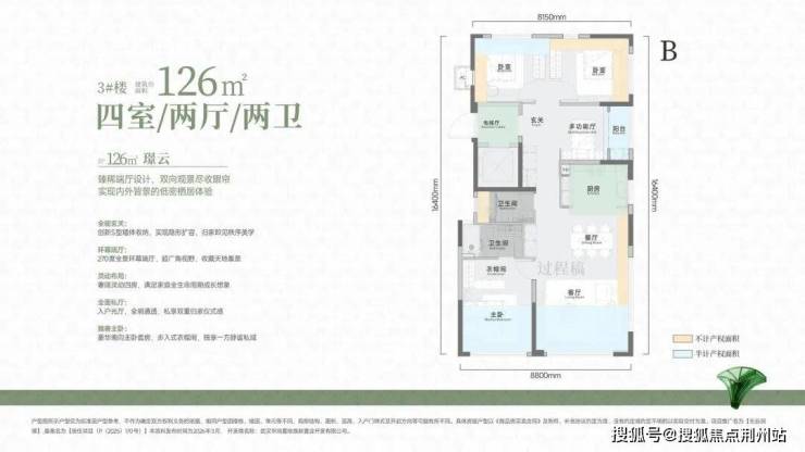 重点户型。这个面积段有两个版本:大面宽版和端厅版(带270度采光设计)。四房两卫,家里有老人同住或需要独立书房的家庭,这个户型非常实用。