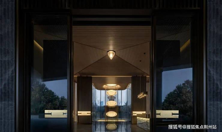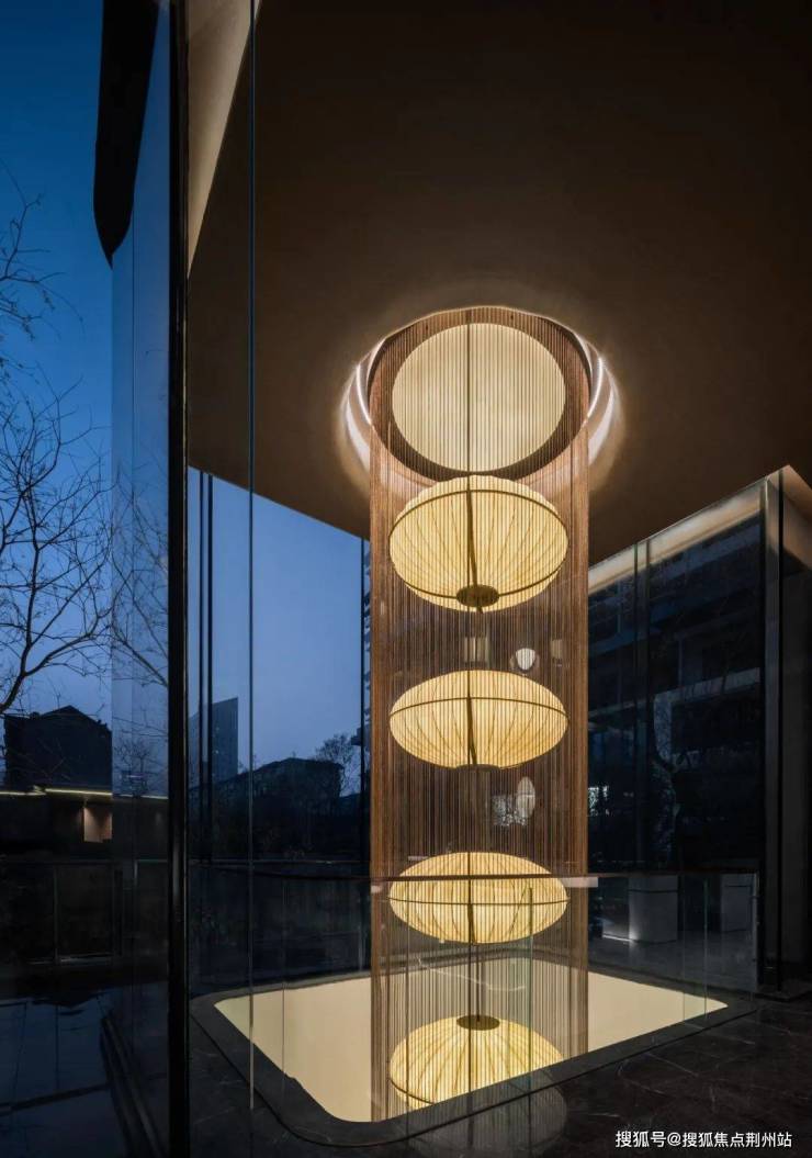 夜色为幕,深棕沉敛。“观白玉泉”艺术装置成为主角,层叠圆盏若水滴落幽潭,漾暖黄涟漪漫入空间。玻璃外树影朦胧相呼应,宾客踏入,喧嚣被滤,于光影交织里,沉浸式感受宁静的氛围,任心绪随“涟漪” 轻晃 。