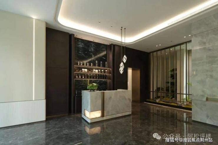 入户大堂做了挑高和非常精致的装修,还配置了物业前台和休闲会客区。