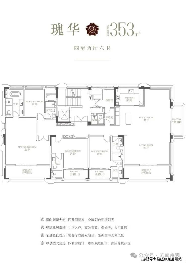 建筑面积约353㎡瑰华洋房户型,南北纵向边厅,收藏级稀缺大平层。三阳台设计,实现270度园景、水域、城景视野三重奢享。