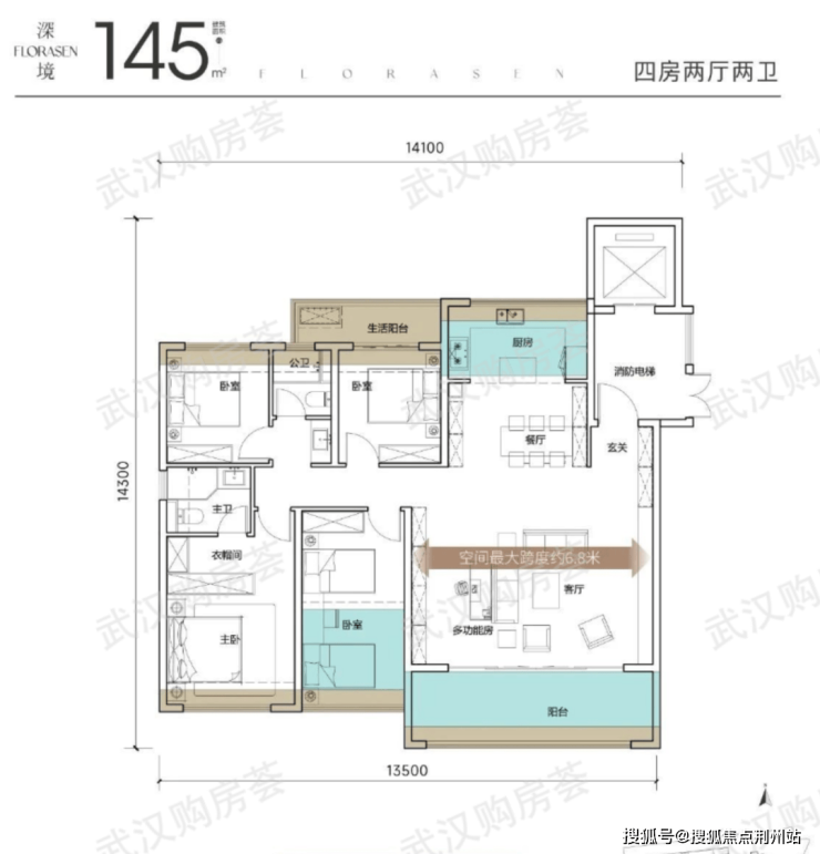 南向阳台做到了三开间,阳台外还有花池,加上北面的飘窗、设备平台、生活阳台(空调机位)等空间,宣传可达约97%,较境湖玥的约93%更高;