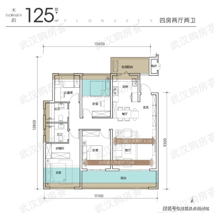 南向开间约11.1米,其中客厅最大开间可达约7.5米(大横厅布局),整体南向开间尺度、客厅尺度、主卧面宽对比境湖玥125平户型都有所减小,进深尺度则有所加大。
