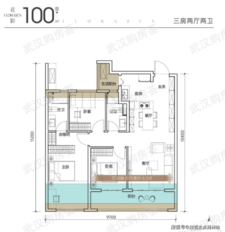 整个南向开间约9.7米,客厅开间最大约6.5米(大横厅设计下),与境湖玥是一样的,主要是整个户型更加方正,明显优于境湖玥99平户型。