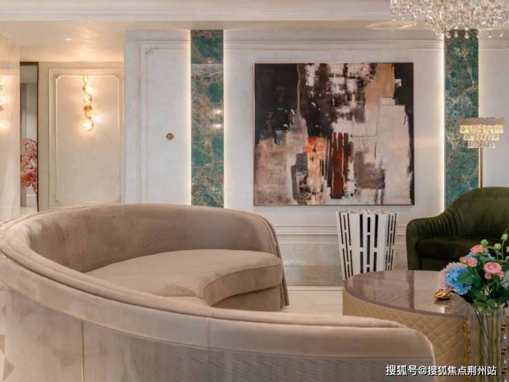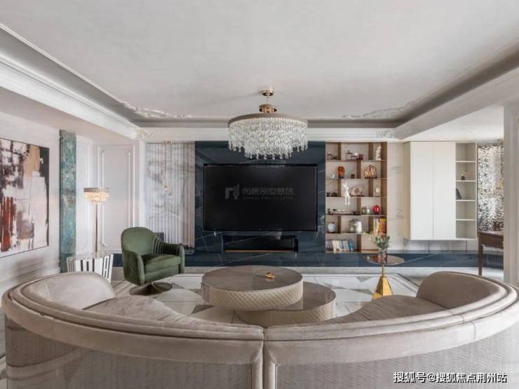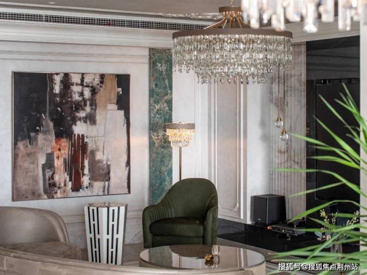 客厅的舒适感,足以让人忘却一天的疲惫。沙发设计简约而不失优雅,圆弧造型散发出艺术般的典雅气息。墙面上的法式装饰线条增添了一抹温馨与舒适,水晶吊灯的璀璨光芒为整个空间带来了明亮与奢华的味道,而绿色的座椅更是成为了这个空间的焦点,宛如一幅美丽的画作。
