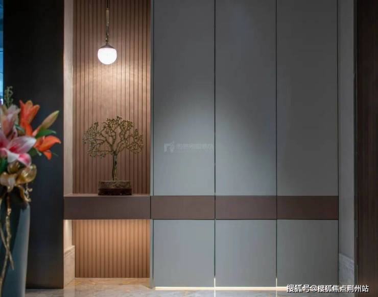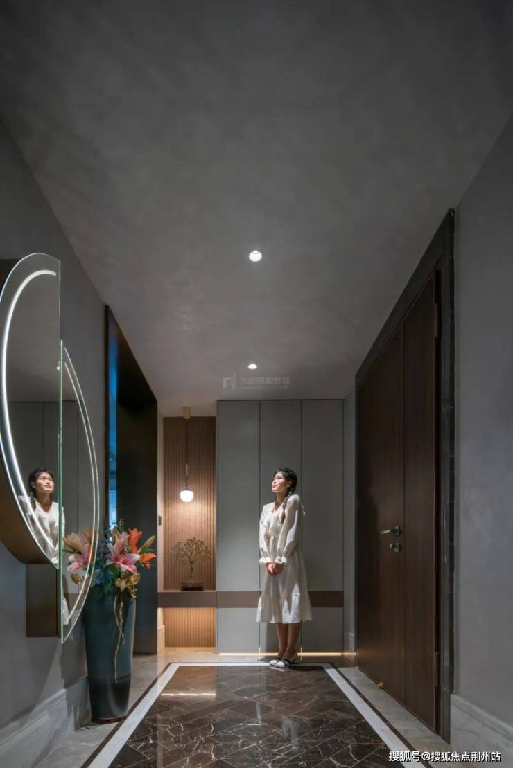 现代都市生活的繁华与静谧交织,入户玄关以皮革装点,巧妙的开孔设计捕捉着天际的晚霞,落地灯的线条优雅,营造归家的温馨与仪式感。