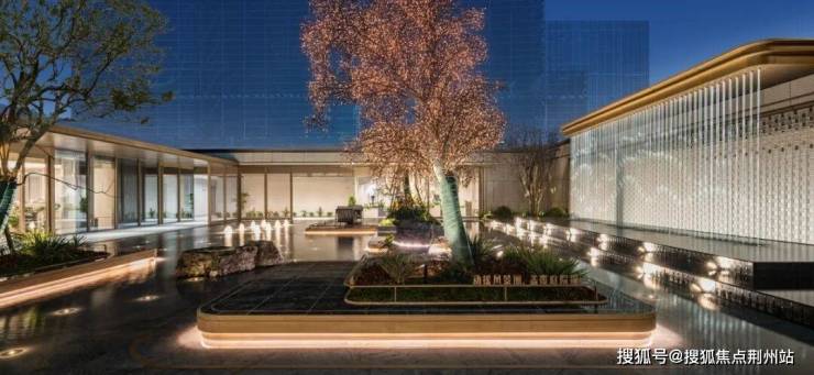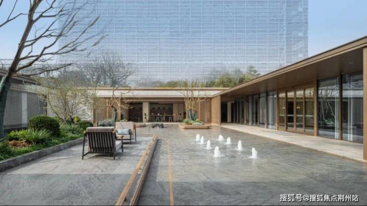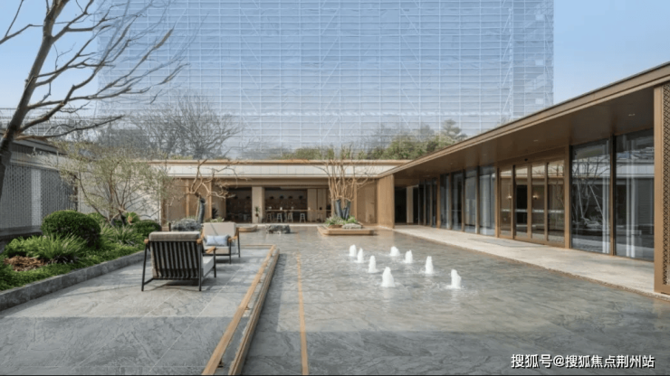 从云端俯瞰,下沉式庭院仿若一方被时光雕琢的翡翠砚台——四水归潮,聚气藏风。建筑围合出静谧的方形天地,叠瀑飞珠、静水映天,形成“天井纳万象”的东方格局。在此停留,仿佛步入“荫松谡秋籁,听瀑落泉花”的宁静境界,享受一份悠然自得的心境。