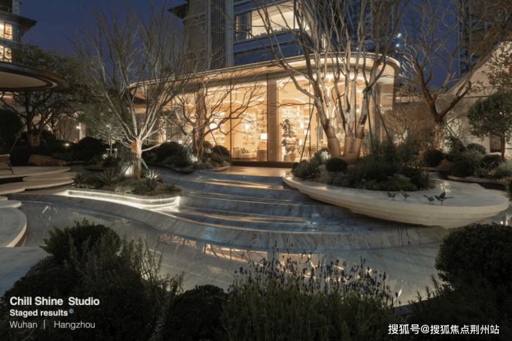 水景特选白金沙石材,以独特工艺进行丝绸感处理,“揉石成缎”,水流随石材的褶皱肌理蜿蜒而下,光洁如丝缎,波光潋滟,为场地创造出一份独一无二的印记。