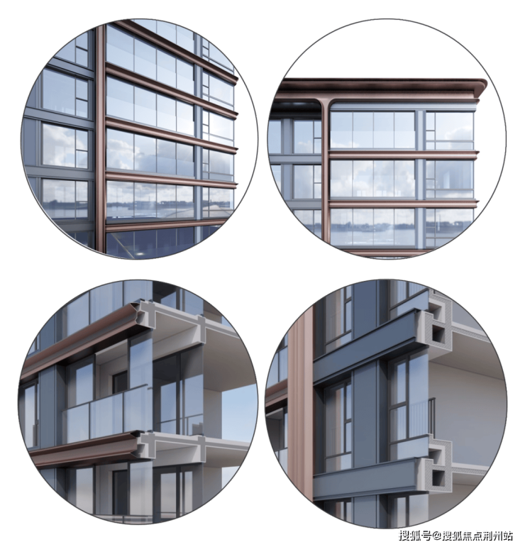 为了符合项目的定位,在建筑材料的选择上,整体以古铜色的金属线条为框架,以浅灰色铝板+大面积玻璃为主体,从而打造具有标志性的立面,彰显现代简约的豪宅品质。