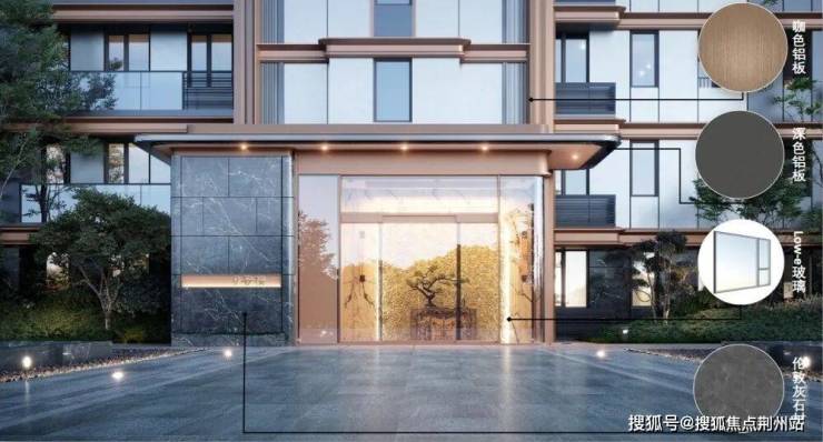 入户大堂采用非对的建筑形式,大面积玻璃与石材形成的虚实对比,石材的持正与铝板的光韵结合,既贵且雅;飘逸挑檐及豪华内饰更加突出大堂的轻盈大气;为业主营造舒适的入户体验。