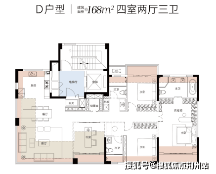 168㎡户型的设计理念基于“N+X灵动哲学”,打破了传统户型的刚性边界,以开创性的空间设计,实现了“生长型有机体”的居住理念。