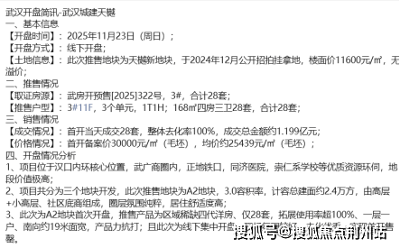 武汉城建天樾项目本次推出的是A2地块3号楼的洋房产品,共28套。备案均价30000元/㎡(毛坯),实际均价约25439元/㎡(毛坯);首开当天成交28套,整体去化率100%,成交总金额约1.199亿元。