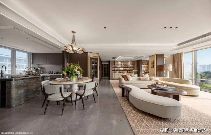 LDK一体化设计的餐客厅与观景阳台相连,将湖光与园景无界延引入室,实现居住与自然的深度对话。