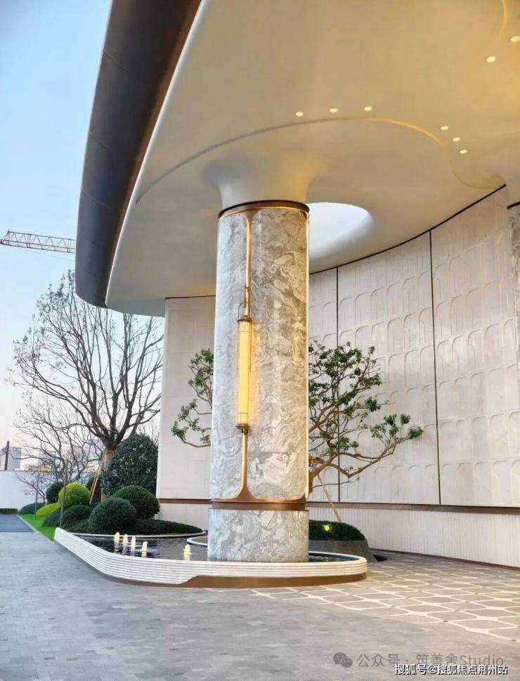 灵感源自上海前滩华尔道夫酒店,倾力打造约46米超长界面、9米挑高,以弧线繁复工艺和千万级巨资构筑高奢门厅。以月光米黄石材为主基调,弧形景墙、安第斯雪景奢石柱子,更严苛甄选名贵铁冬青,冠幅巨大、昂然迎宾,尽显尊贵门仪与华贵气度。