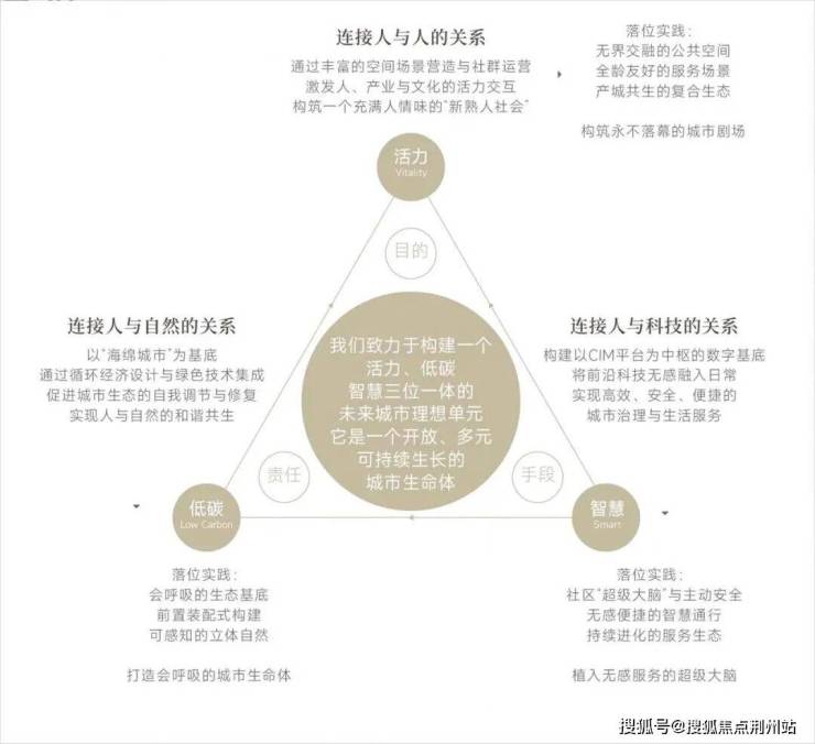 “未来城市”理念由底盘、核心和场景构成,要求项目以“15分钟生活圈”为基础,融合生活、工作、学习、休闲娱乐等功能,满足80%的城市服务需求,形成24小时活力空间。同时,通过低碳和智慧技术的创新,支持该理念的实现。