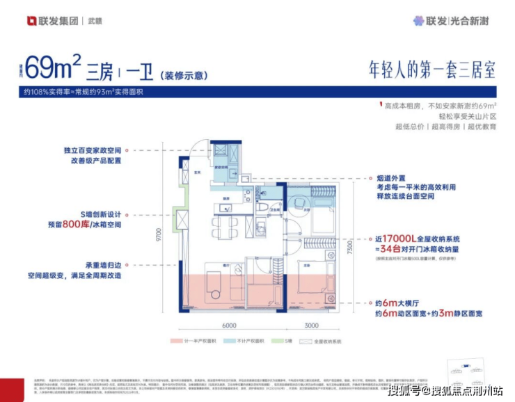 你敢信?建面约69平,能做正规三房!而且不是那种憋屈的“2+1”,是真真正正三间卧室,南向面宽还做到了9米。