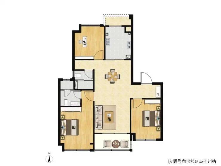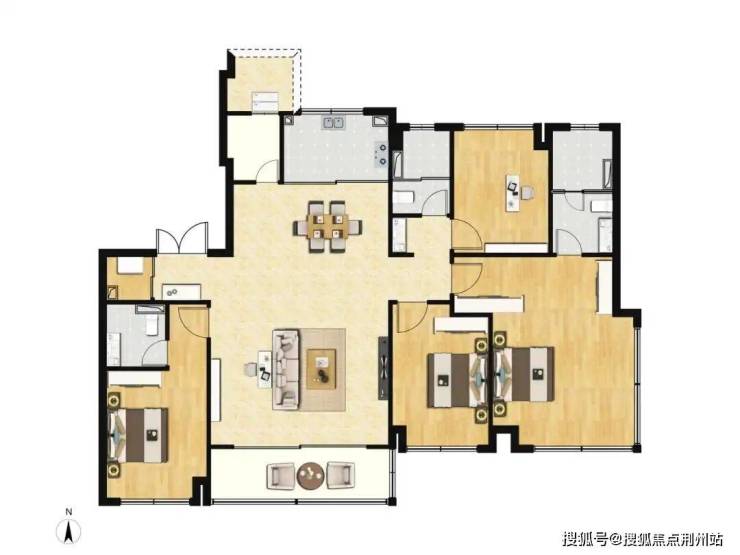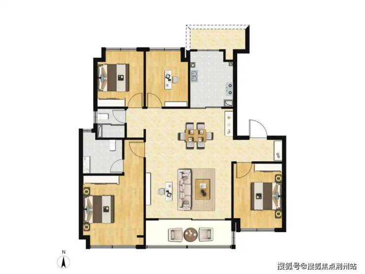 四叶草户型布局,无过道浪费,四开间朝南,南北通透,客餐厅一体化设计,空间感通透开阔;