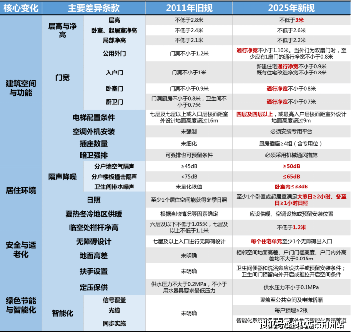 新建住宅层高≥3米,卧室/起居室净高≥2.6米,厨房/卫生间净高≥2.2,解决吊顶压抑和设备安装问题。
