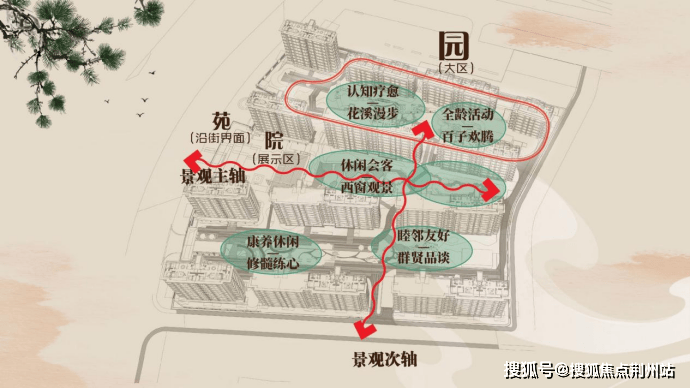 项目保留原址百年银杏、紫藤、老桩银杏等古树,以 “一环两轴五景” 园林体系串联: