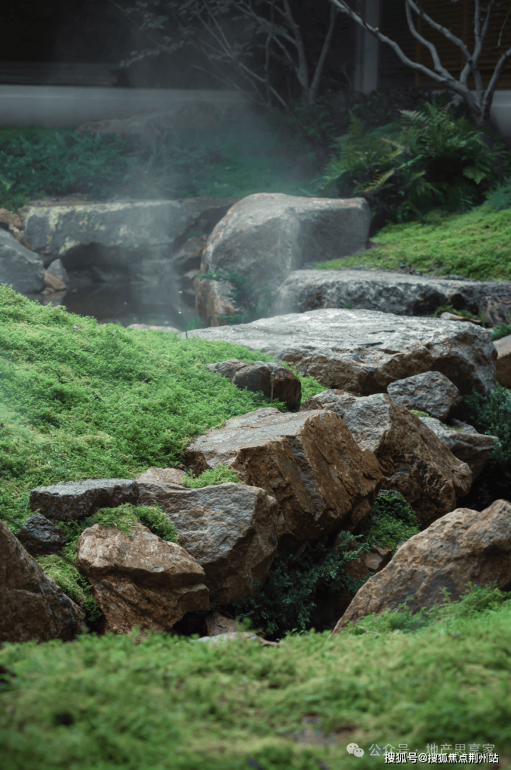 从下沉式庭院,到洋房区中心景观,到叠墅区山地景观,原石、青苔、大树与远山和世园浑然一体。