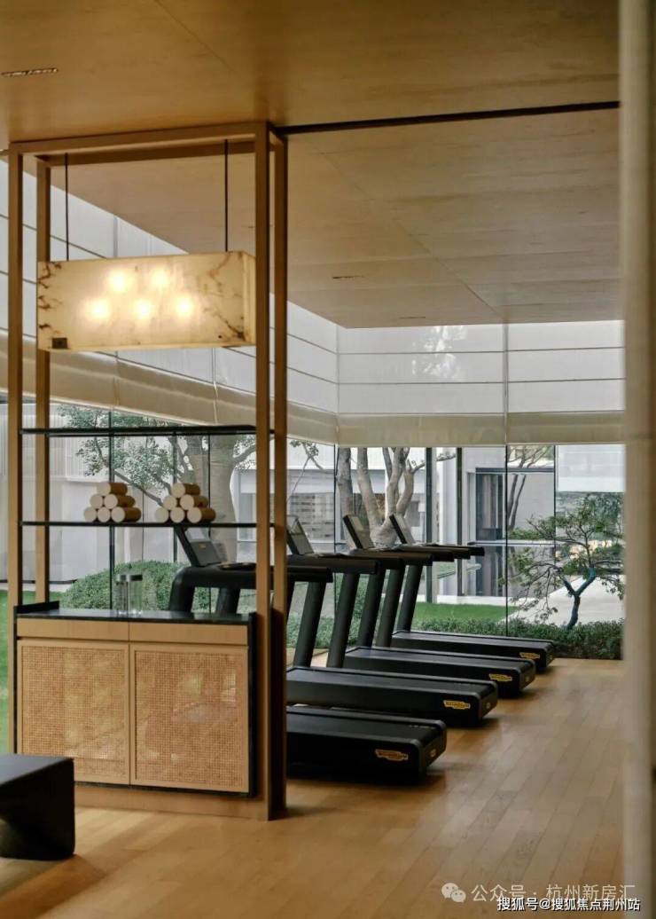 健身房内光线柔和自然,器械在浅色木纹与素水泥的环绕中静置。落地窗外是流动的城市光景,运动时向外望去,仿佛与室外保持着一种安静的对话。空间没有多余的装饰,只让器材的轮廓与窗外的天光,构成简单而舒展的运动场景。